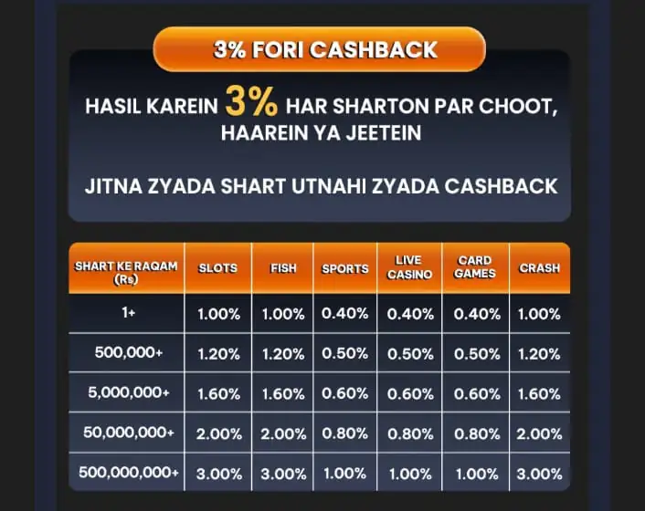 The first bonus that every new player loves is the Pehla Deposit Bonus (108%). When you make your first deposit, you are rewarded with an extra 108% of the amount. For example, if you deposit 1,000 PKR, you instantly get 1,080 PKR as a bonus. This is one of the most generous bonuses because it almost doubles your balance right from the start.
